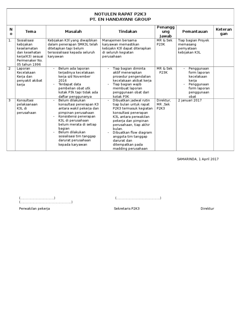 NOTULEN RAPAT KKM 3 from imgv2-1-f.scribdassets.com Setiap kegiatan rapat harus menyertakan notulen agar dapat memudahakan membuat laporan. Notulen rapat adalah sebuah catatan singkat atau ringkasan dari hasil sebuah rapat. Simak contoh notulen rapat di sini, yuk! Entah itu organisasi kesiswaan, kemahasiswaan ataupun organisasi perusahaan. Notulen tidak hanya diperlukan untuk acara skala kecil saja, tetapi juga acara skala besar. Berikut adalah cara membuat notulen rapat dengan baik dan benar. Dalam setiap rapat, pasti dibutuhkan adanya notulen. Notulen rapat dibuat dalam bentuk ringkas, padat dan jelas serta berurutan atau sistematis.
