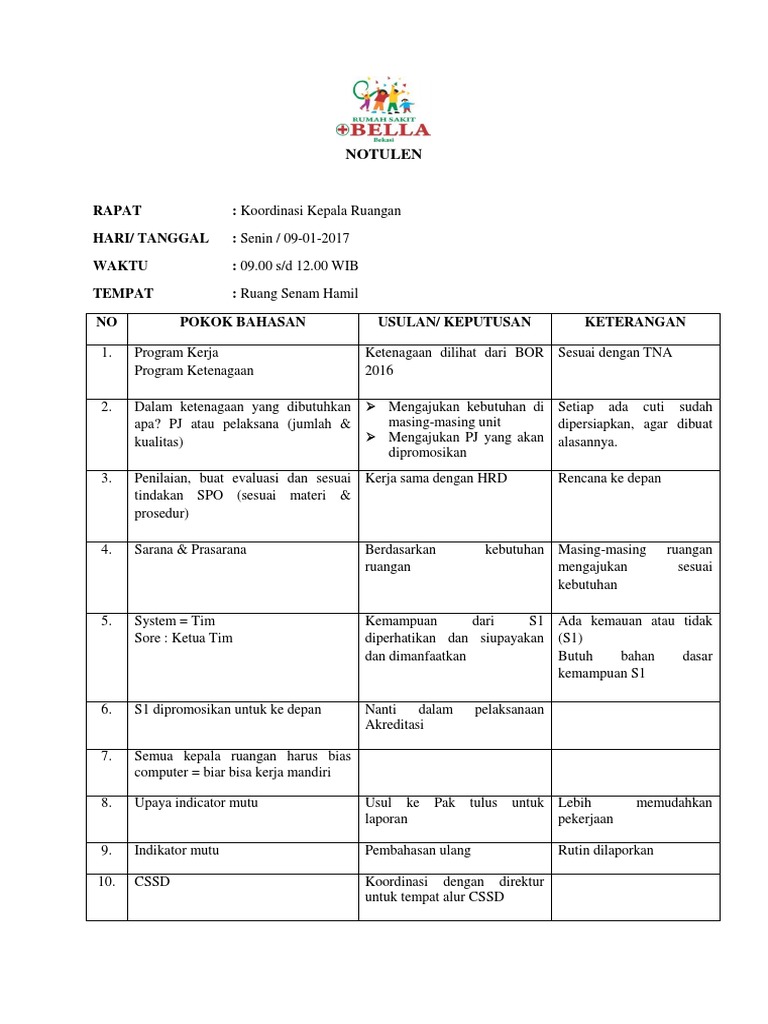 7 Contoh Notulen Rapat Terlengkap Dilengkapi Dengan Cara ... from contohsurat.co Hallo sobat kesempatan ini rumussoal.com akan menyampaikan artikel makalah tentang format notulen rapat pada. Untuk menulis notulen rapat yang efektif, anda harus menyertakan risalah rapat adalah kontributor efektif untuk rapat yang berhasil, namun notulen itu perlu ditulis dan didistribusikan dengan tepat. By guru dafaposted on november 19, 2020. Quipperian, apakah kamu akrab dengan istilah notulen? Seringkali dikantor mengadakan rapat atau meeting dengan rekan kerjanya, dengan bertujuan agar meningkatkan performa kerja atau sebagai bahan evaluasi. Notulen rapat merupakan suatu dokumen yang fungsinya sebagai bukti apabila suatu perusahaan atau organisasi sudah melakukan kegiatan diskusi maupun rapat guna membahas suatu topik tertentu. Dalam setiap rapat, pasti dibutuhkan adanya notulen. Organisasi yang baik tentu harus memiliki administrasi yang baik juga.